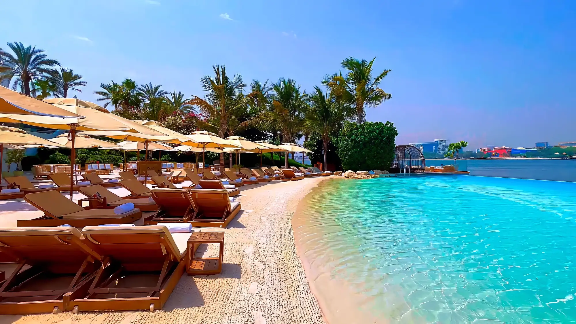 Начнем с тяжелой артиллерии. Aura Skypool технически вообще не пляж — здесь нет ни грамма песка. Расположенный на 50-м этаже башни The Palm Tower, этот бассейн парит на высоте 200 метров и удерживает титул самого высокого в мире панорамного бассейна с обзором на 360 градусов. Ощущения сюрреалистичные: вы плывете по периметру здания, а под вами, как на гигантской Google-карте, разложена Пальма Джумейра, отели Atlantis и бескрайний горизонт залива. Вода здесь кажется продолжением неба, а влажность, которая душит внизу, на этой высоте чуть менее беспощадна.